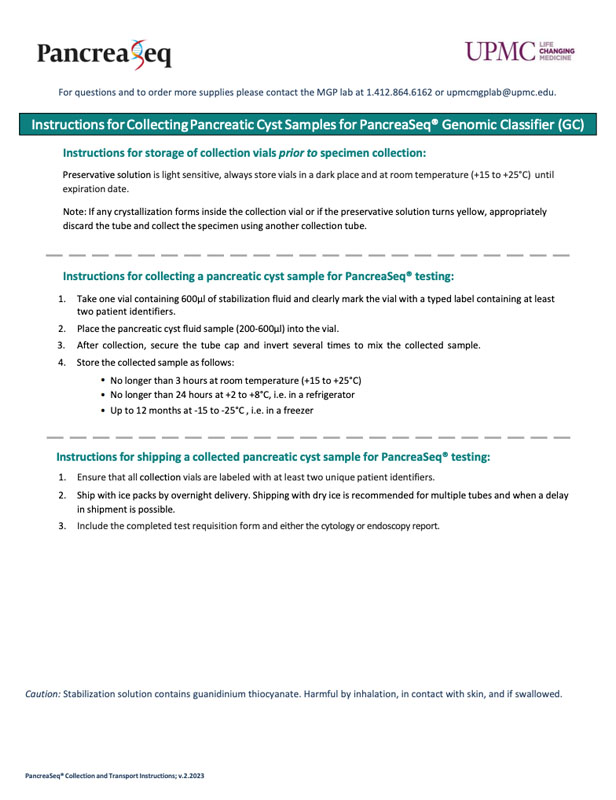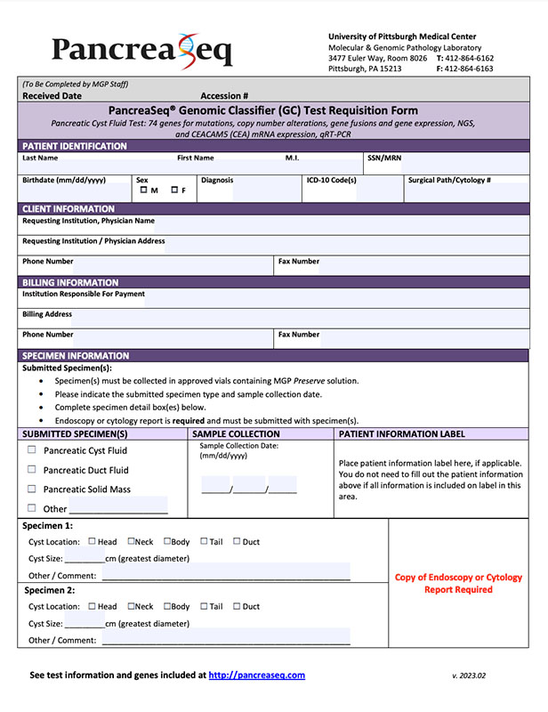 All samples must be accompanied by EUS-FNA or Cytology Report and a PancreaSeq Requisition Form